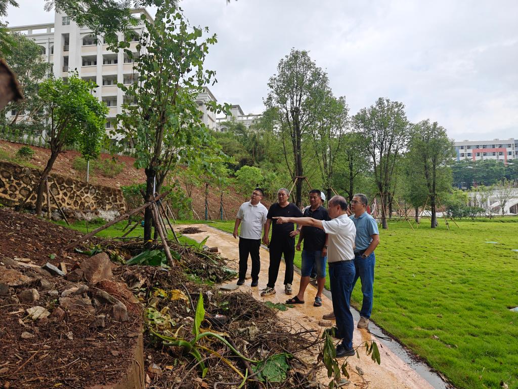 邓逢光检查环湖周边新种植绿篱安全隔离效果,大桥两端至西湖北侧谷底台阶护栏老化损坏,桥梁护坡石阶坍塌、台风后竹林折断遮挡人行道等安全隐患,并要求后勤保障部及项目施工队对现场发现的安全隐患及时进行整改。